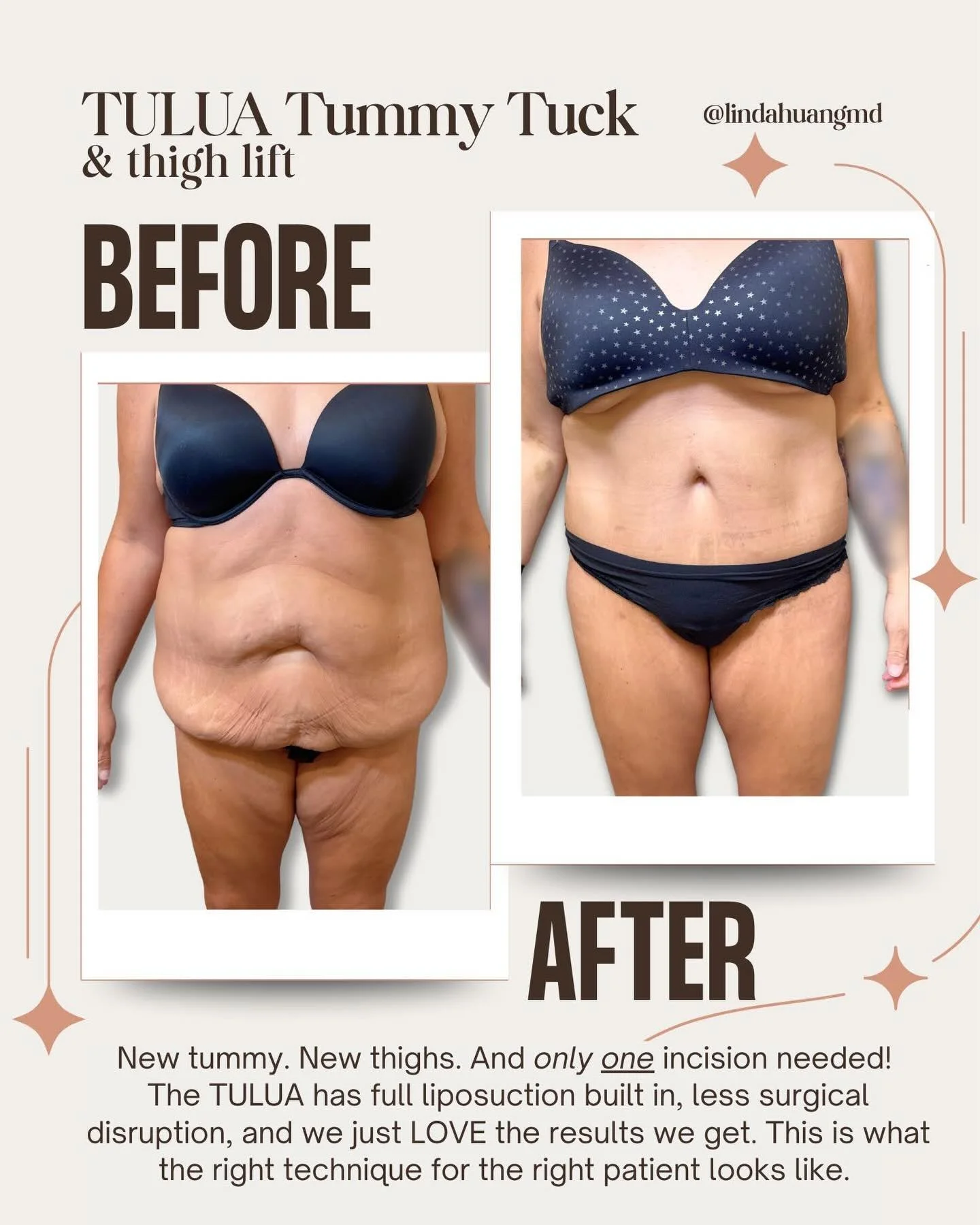 Absolutely amazing from beginning to end!! My results are beautiful, my experience was great I was so nervous and she and her whole staff made me so comfortable from beginning to end!! Doctor Huang's bedside manor is amazing and the patient relationship is truly one of a kind! You know how special a Doctor/employer is when her staff talk about how long they have worked for her [decades!] and truly love working for her that says a lot about the person... Trust me you won’t be disappointed, I would highly recommend Doctor Linda Huang -- she my Champion!!