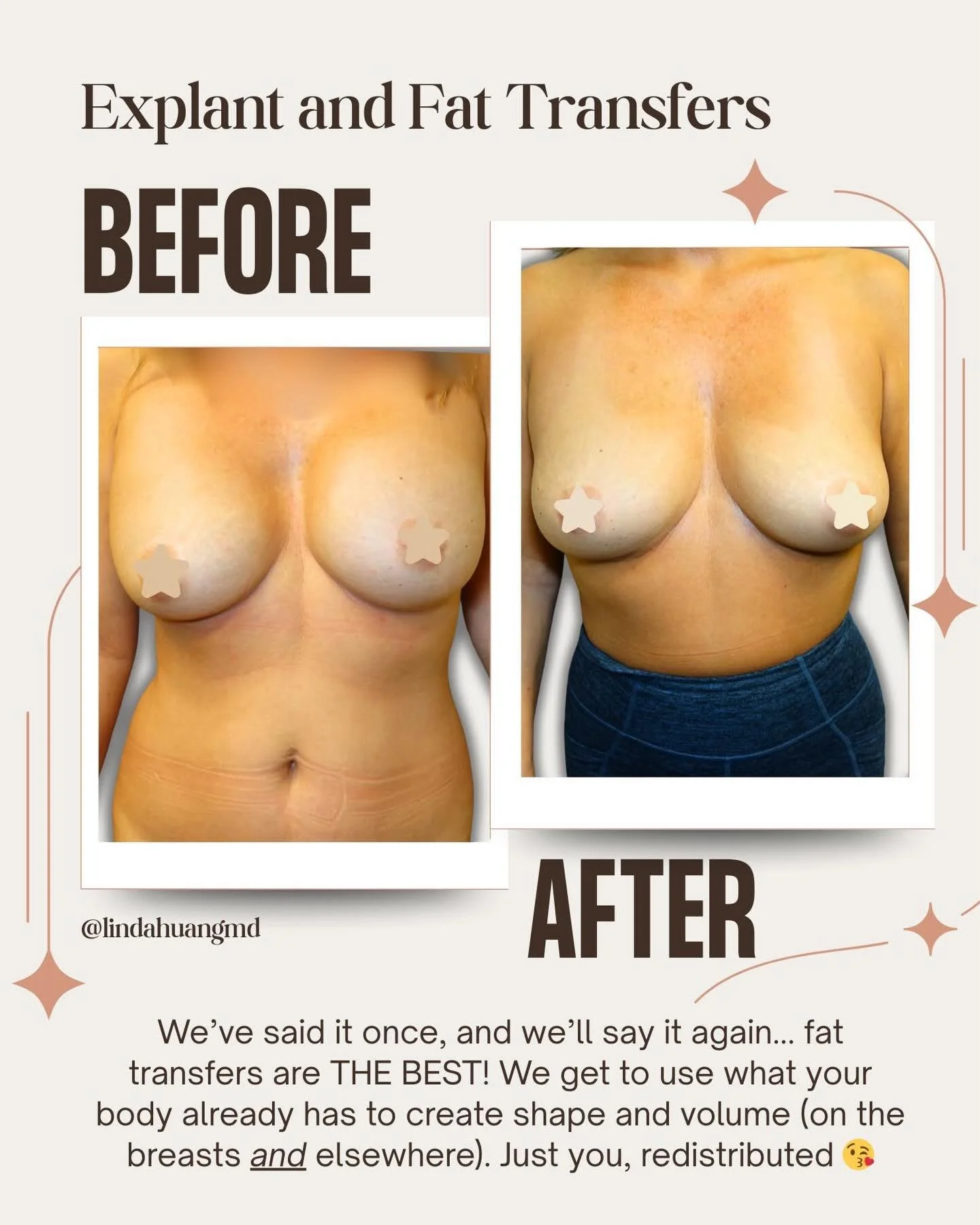Dr. Linda Huang is not simply the most gifted plastic surgeon around, but an amazing artist with a true understanding of what looks natural and fabulous and how to achieve it. The fat grafts that she completed on my face have given me at least ten years back. I look at pictures of when I was in my early thirties, and my face looked natural and youthful and I have it back now. No longer do I have bags under my eyes and serious crows feet, and what's really great is how she achieved this by so very carefully placing fat in just the right places!!! No stitches! Yes there is social downtime due to bruising and swelling. But SO what, WOW talk about worth it. I have had botox and juvederm but nothing compares to your own fat in my opinion.