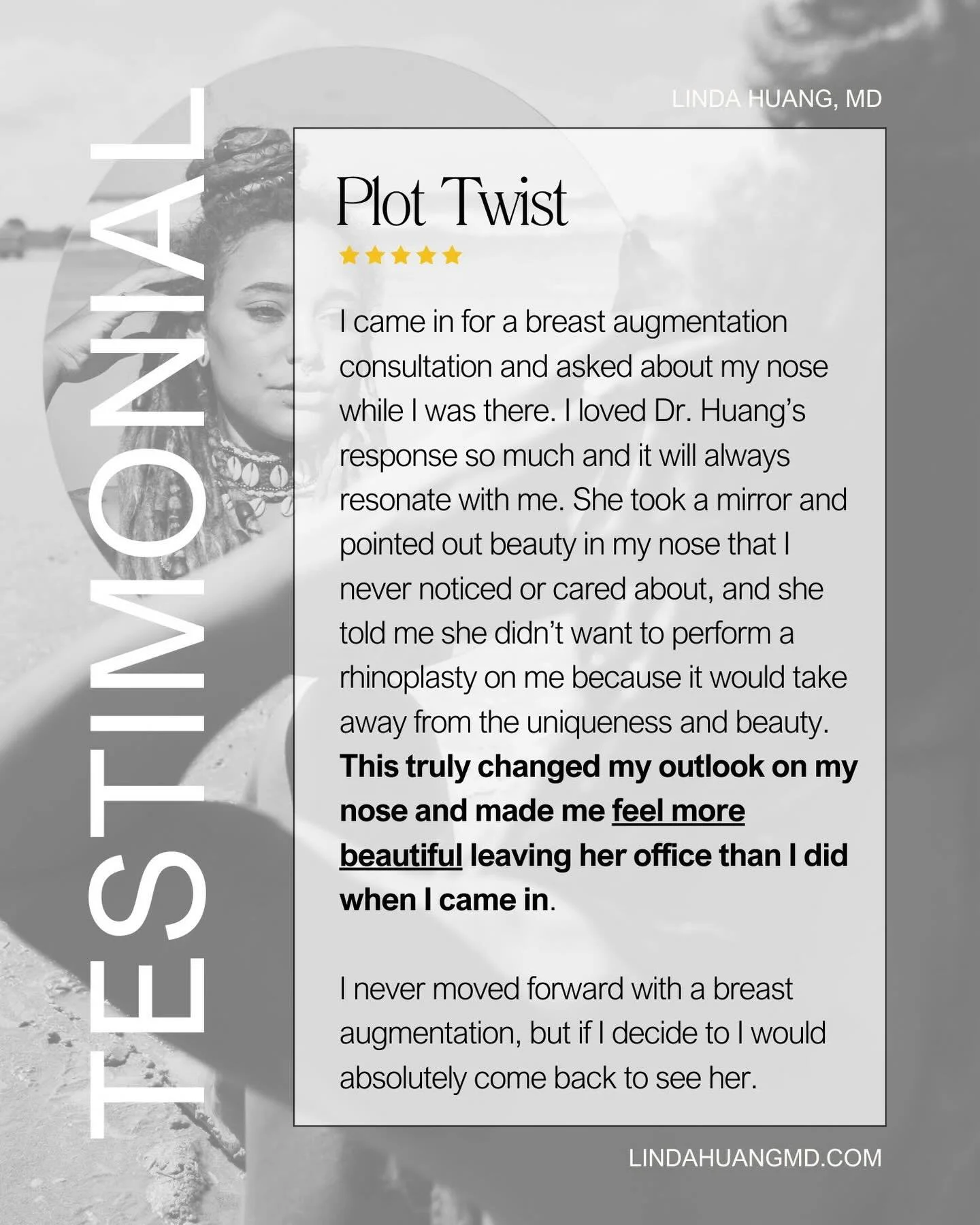 I would not hesitate to recommend Dr. Linda Huang and her expertise to any person seeking a Plastic Surgeon. I feel very blessed to have found her. Thank you Dr. Huang for helping me through the journey to regain my lost years.”